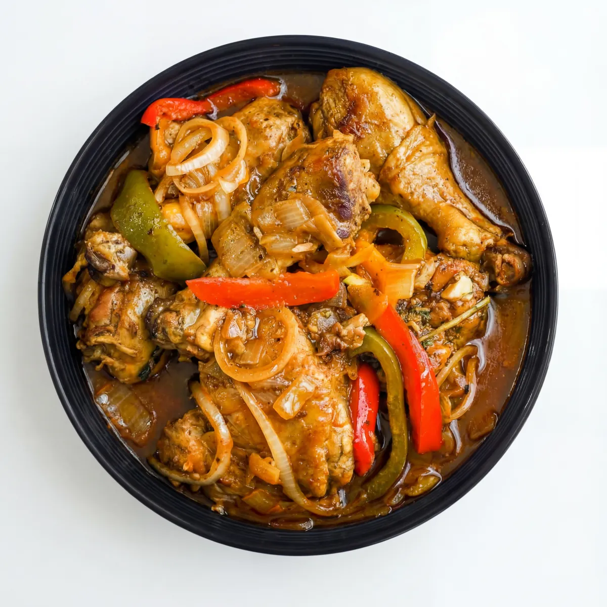 Tender chicken simmered in a fragrant curry sauce with herbs, peppers, and island spices served with white rice