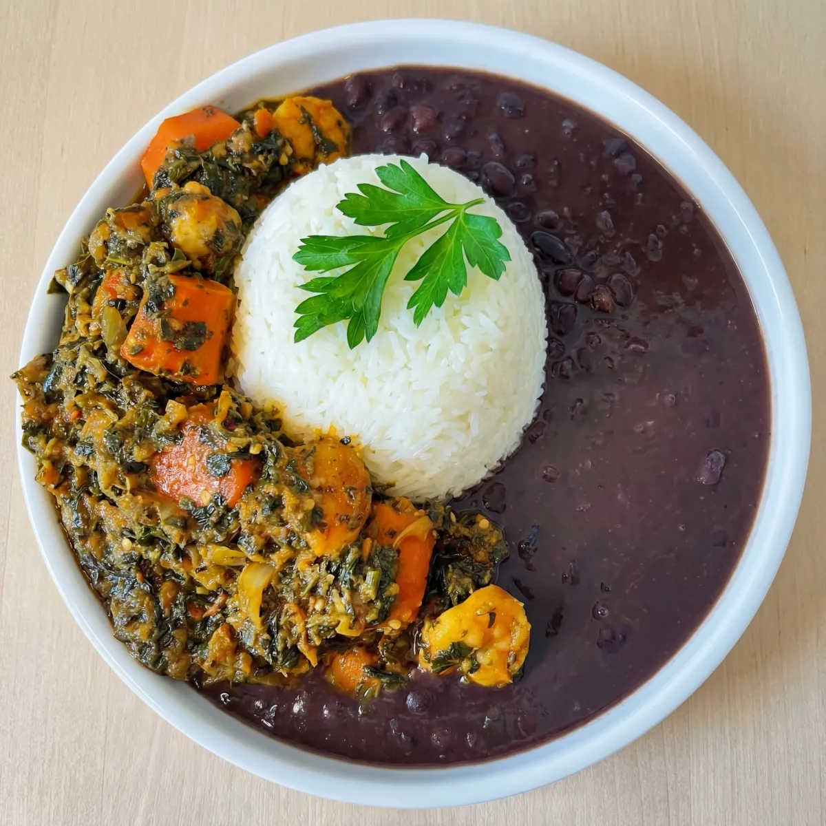 A savory blend of stewed vegetables and herbs, simmered with tender meat and served with white rice or riceand beans.